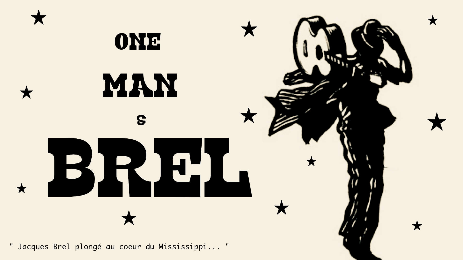 Xavier Bray (Virago, Eiffel, Nadj, Mama Rosin…) revisite en solo et avec humour le répertoire de Jacques Brel. Un one man band original où Brel est plongé dans le fleuve Mississippi avec le Bayou comme seul espoir de survie. Accompagné d’une guitare, d’une grosse caisse et d’un frottoir ce spectacle enchantera autant les fans du grand Jacques que les aficionados de la musique rurale américaine.